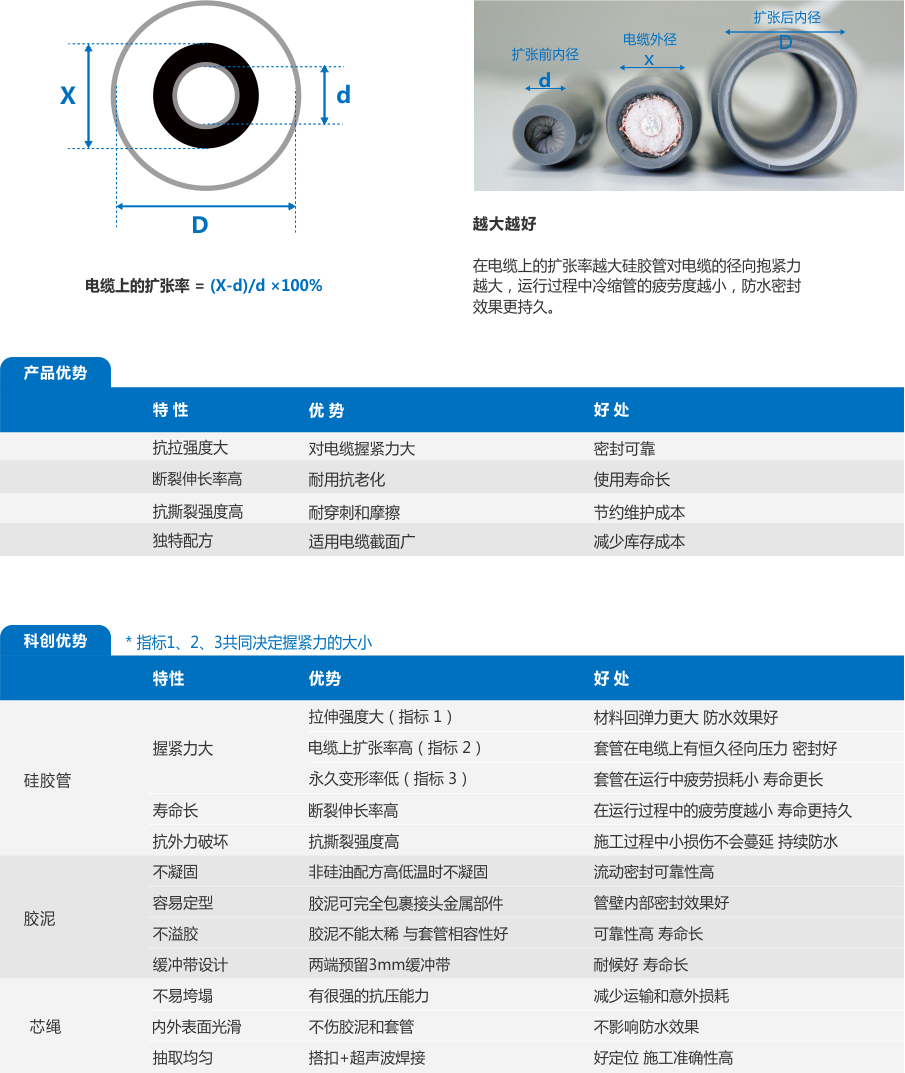 内置胶泥套管是在硅胶冷缩套管两端增加胶泥结构,并在套管的径向压力作用下,让套管和电缆之间形成严密结构的新型基站防水产品,非常适合小空间及密集接头操作,是目前理想、成熟、可靠的防水解决方案。
